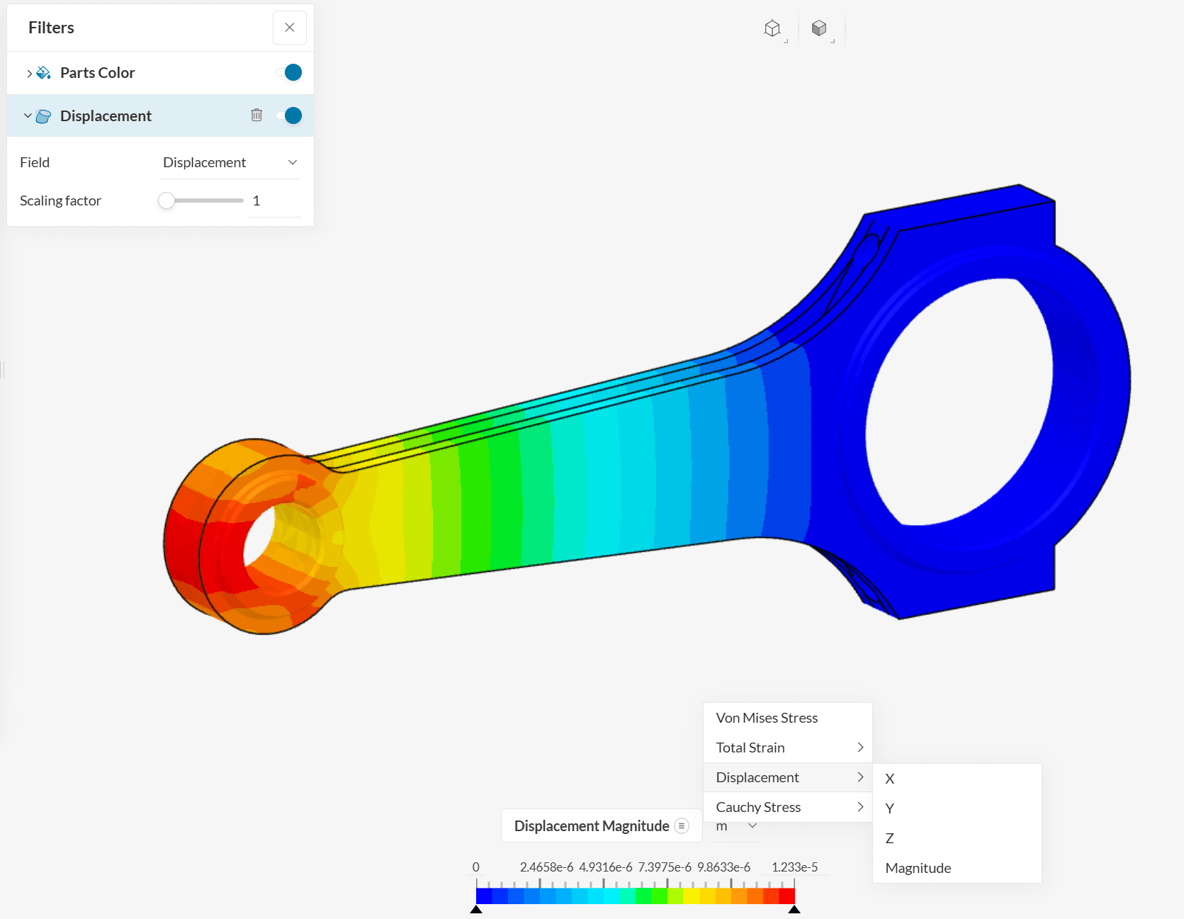 SimScale’s integrated post-processor consists of filters and different viewing tools to better visualize and download the simulation results. Figure 17 shows the default view where the displacement filter is applied with contours of Von Mises Stress for visualization.