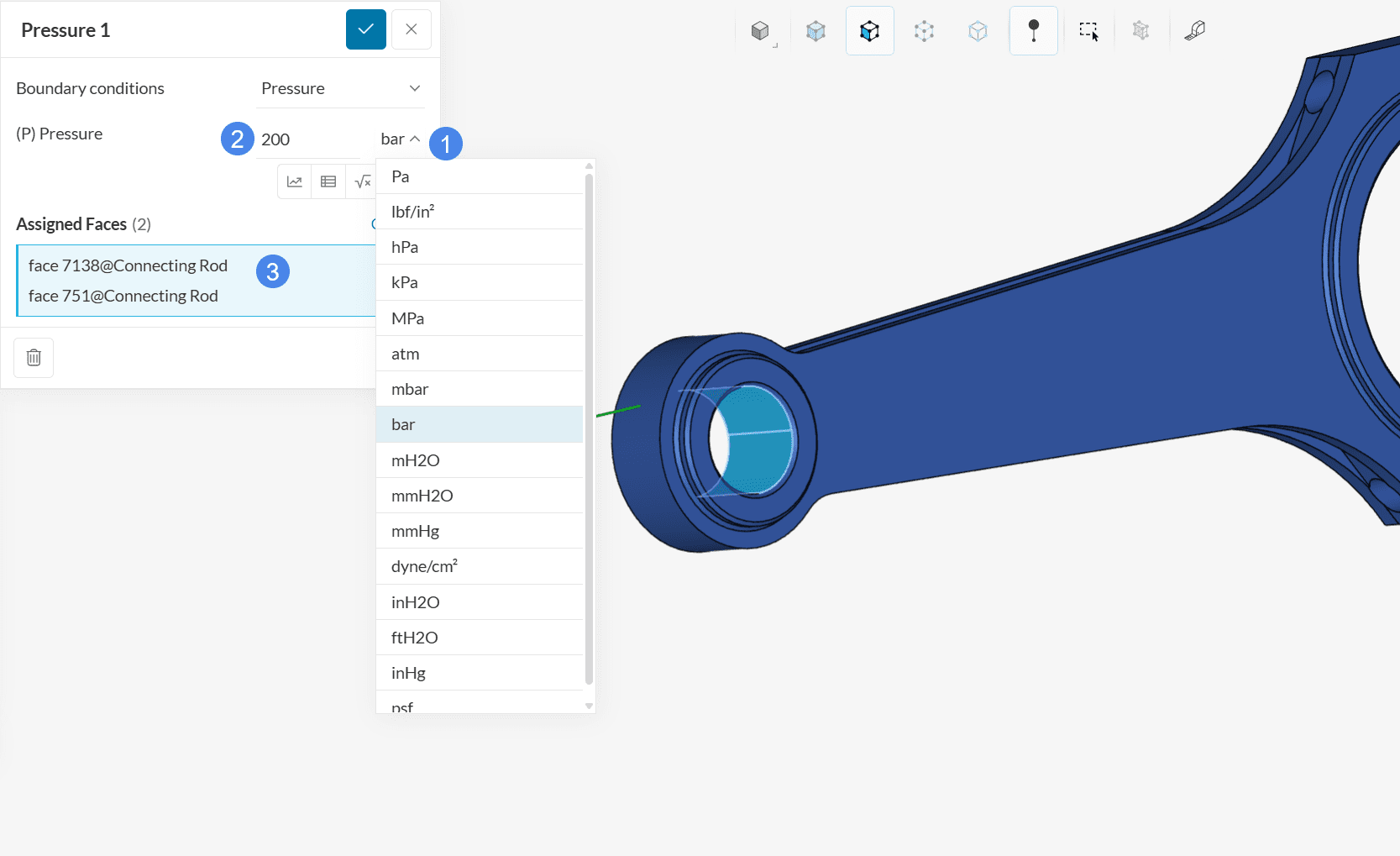 Two boundary conditions, pressure (load) and fixed support, need to be assigned to the connecting rod.