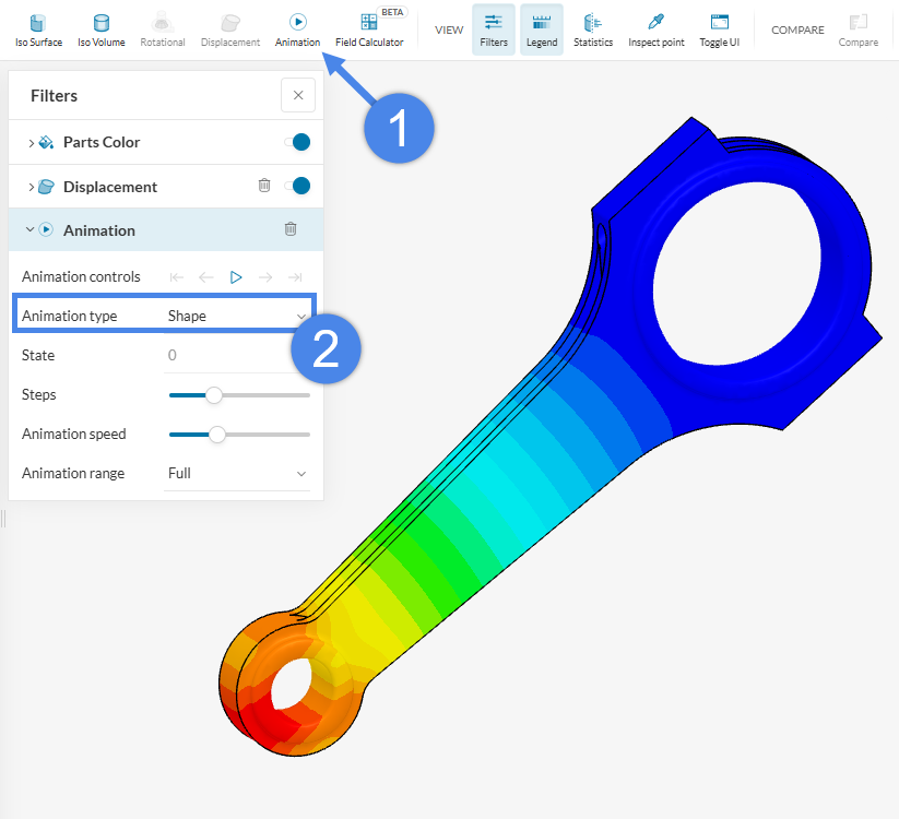 With larger displacements being presented, the animation filter will produce a useful visualization of the part’s deformation behavior. To enable the animation filter for the geometry’s scaled and deformed shape, click ‘Animation’ > ‘Animation Type’ > ‘Shape’.