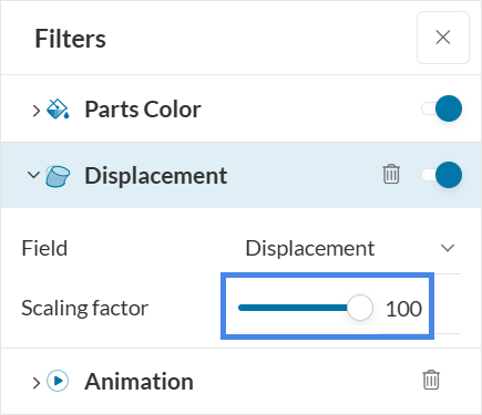 Another common way of displaying linear static FEA results is by creating an animation of the scaled displacement field. Since linear static studies don’t show large displacement levels, a displacement scaling filter can be applied as illustrated by Figure 19.