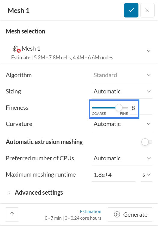 To generate the mesh, use the ‘Standard’ meshing algorithm, which is automated and typically provides good results for most geometries. For this simulation, the only change to be applied to the default settings is changing the fineness level to ‘8’ – and the mesh can be obtained by clicking the ‘Generate’ button. In linear static simulations, SimScale automatically creates second-order meshes, which enhance the accuracy of the analysis.
