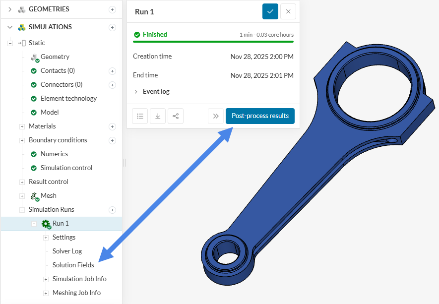 To access the post-processor you can click ‘Post-process results’ or ‘Solution fields’ under your run to load the results in the post-processor.
