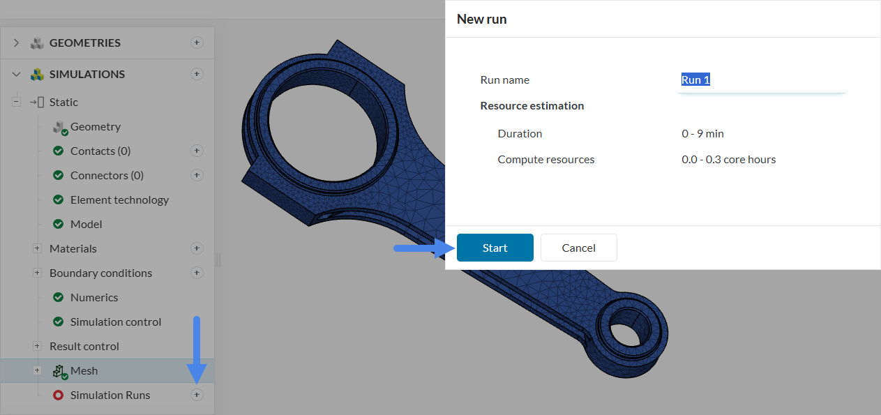 Create a simulation run by clicking on the ‘+’ button next to Simulation Runs in the simulation tree. In the window that appears, click ‘Start’: