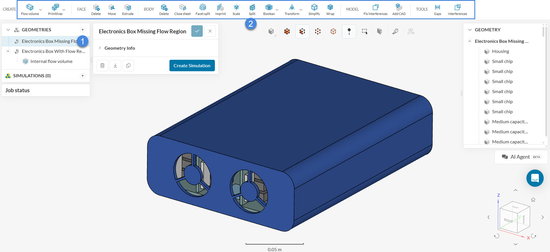 The simulation project contains two geometries. The first one, named Electronics Box Missing Flow Region still needs a final CAD preparation step before it can be used in a simulation. For interested readers, the flow volume extraction step will be explored below.