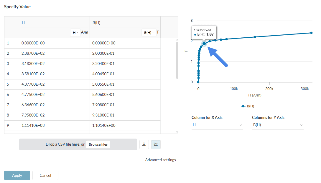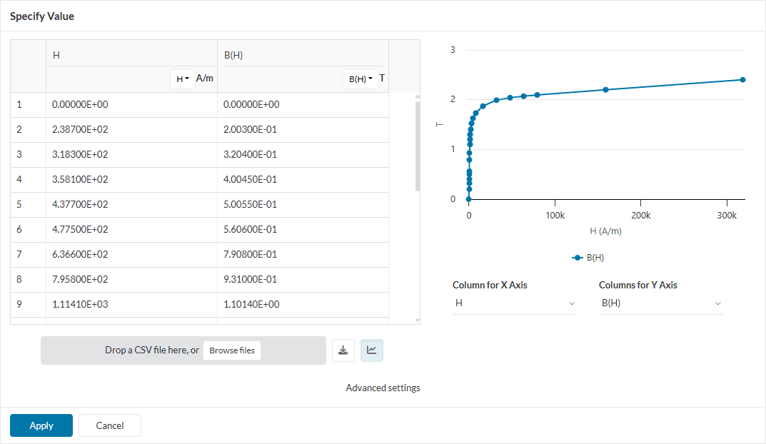 You can find the B/H curve for the AISI Steel material below. Figure 13 shows the assigned material table as well as the B/H curve.