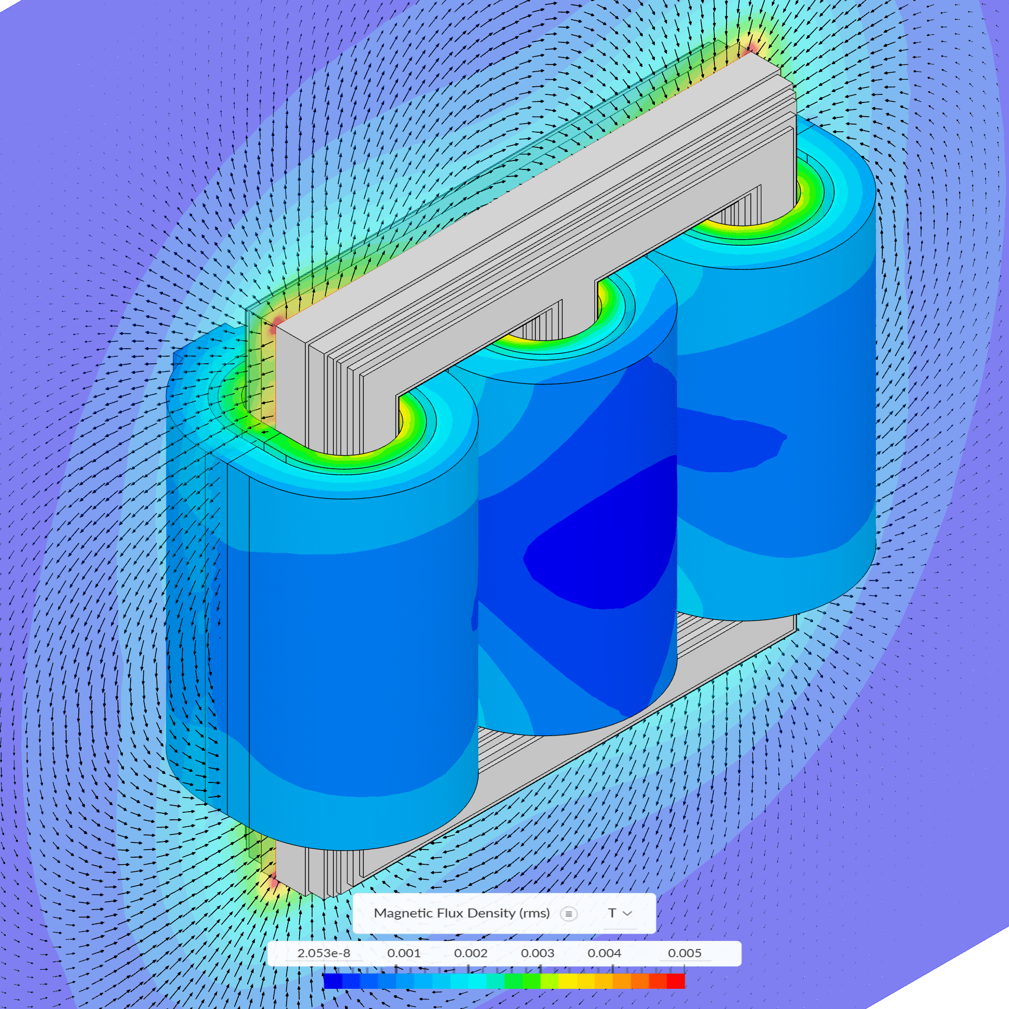 This tutorial showcases how to use SimScale to run a Time-Harmonic electromagnetics simulation on a 3-Phase Transformer, where the objective is to ensure efficient AC power transmission and distribution by evaluating the transformer’s performance under sinusoidal steady-state operating conditions.