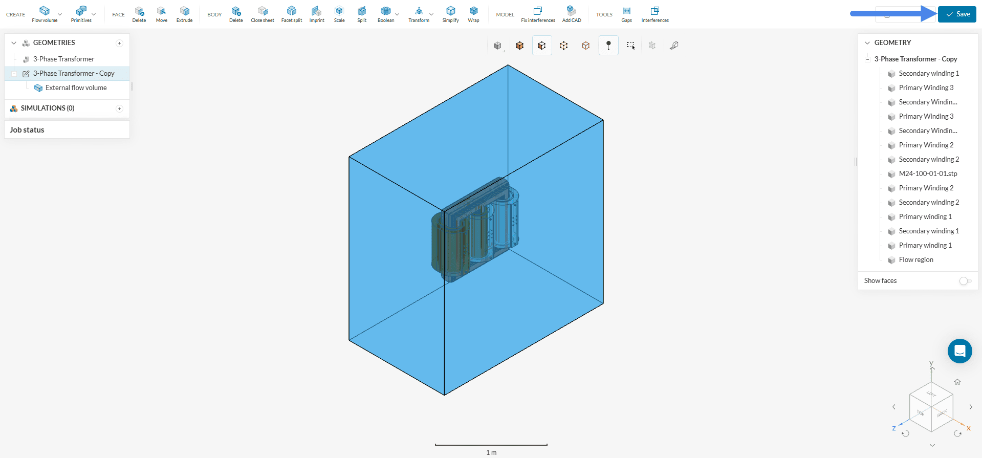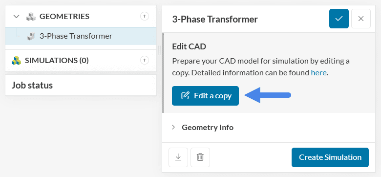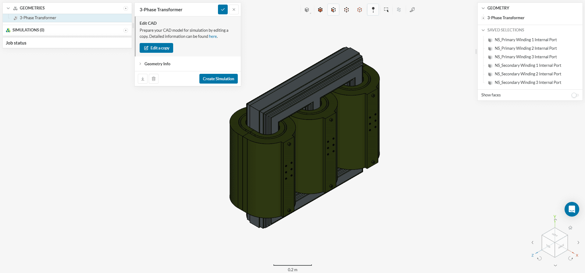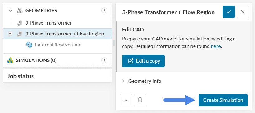 To start the simulation setup process, select the newly saved CAD ‘3-Phase Transformer + Flow Region’ and click on the ‘Create Simulation’ button.