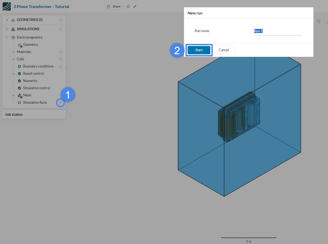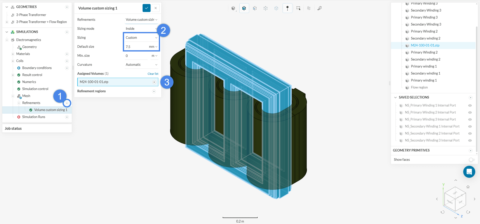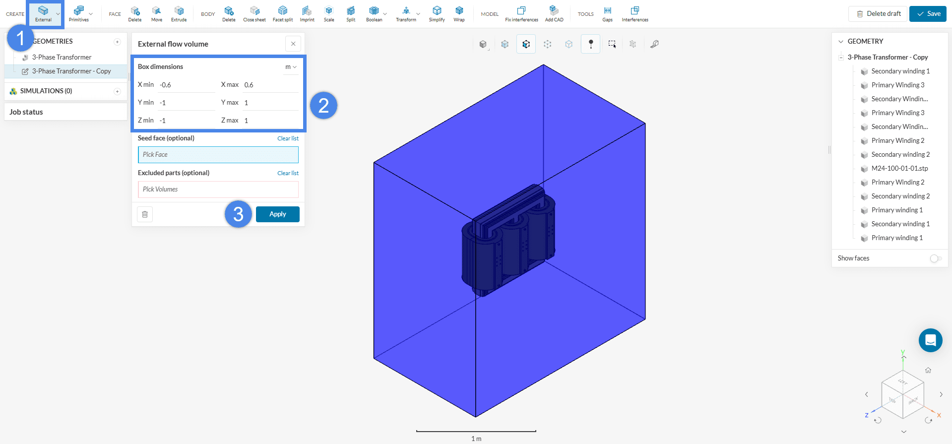 To start the simulation setup process, select the newly saved CAD ‘3-Phase Transformer + Flow Region’ and click on the ‘Create Simulation’ button.