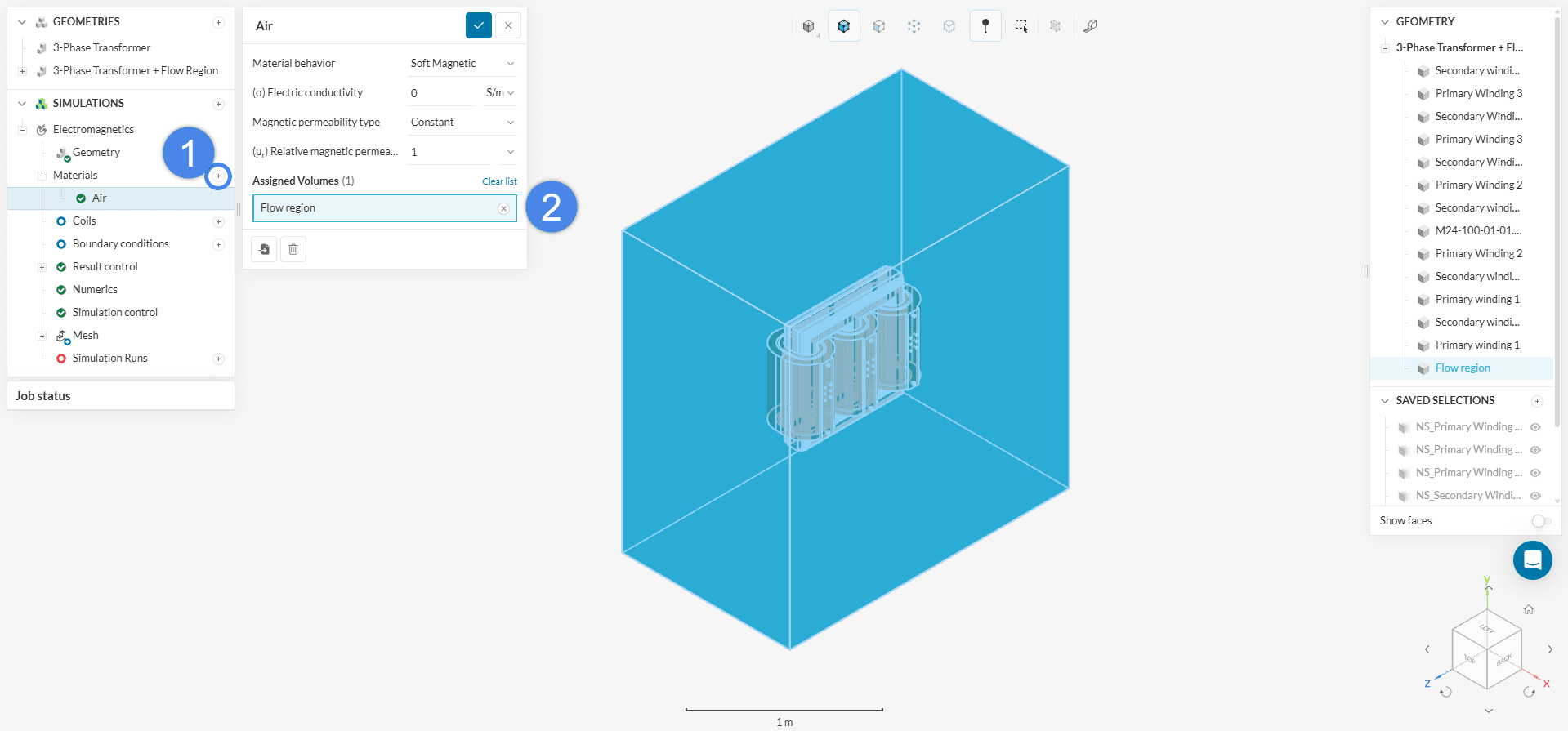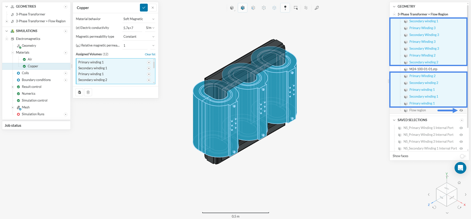 After the save, two geometries are now in the geometry section: 3-Phase Transformer and Copy of 3-Phase Transformer. For better clarity, rename Copy of 3-Phase Transformer as ‘3-Phase Transformer + Flow Region’.