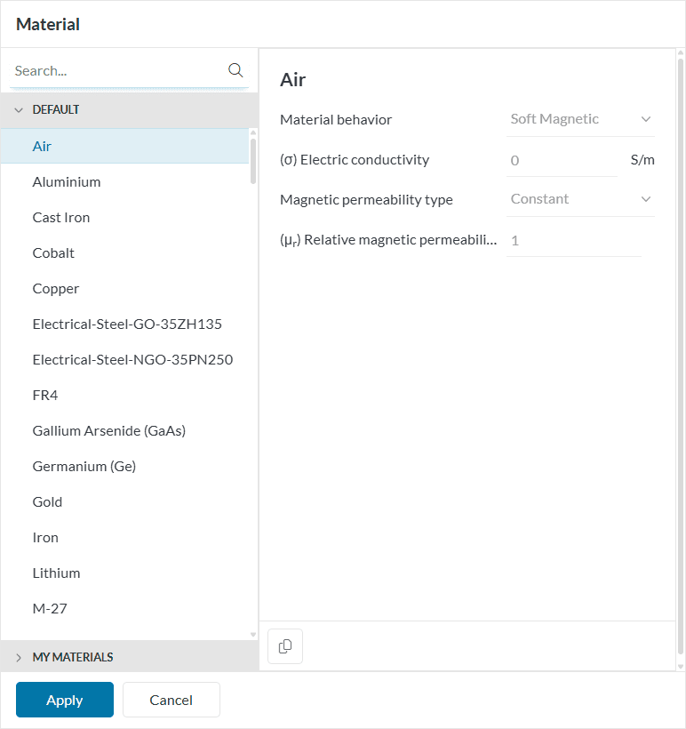 This simulation will begin with air present in the flow region. Then we will assign Copper to the coils and Steel to the core. Therefore, this simulation will use three materials. To start assigning, click on the ‘+’ button next to Materials. In doing so, the SimScale fluid material library opens, as shown in the figure below: