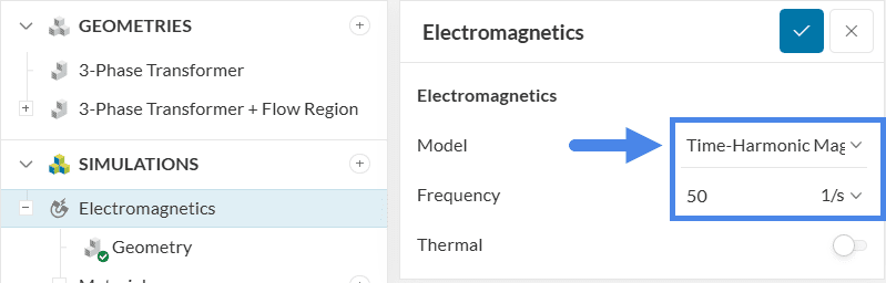 The initial step in configuring the simulation involves adjusting the global settings of the study. These settings influence how the underlying equations are solved and must be defined at the beginning of each project. In this example, the Model will be set to ‘Time-Harmonic Magnetics’, and the Frequency will be specified as ’50 Hz’.