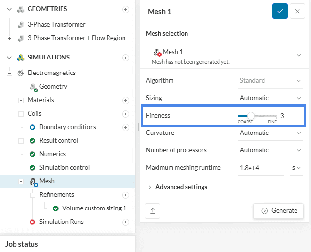 This tutorial will utilize a global mesh fineness level of 3. For users interested in a mesh refinement study, the mesh fineness can be increased by adjusting the Fineness level or by switching the sizing option from Automatic to manual and modifying the edge length range or employing Surface/Volume custom sizing refinements. All these options are described in more detail in the Standard Mesher’s documentation page.