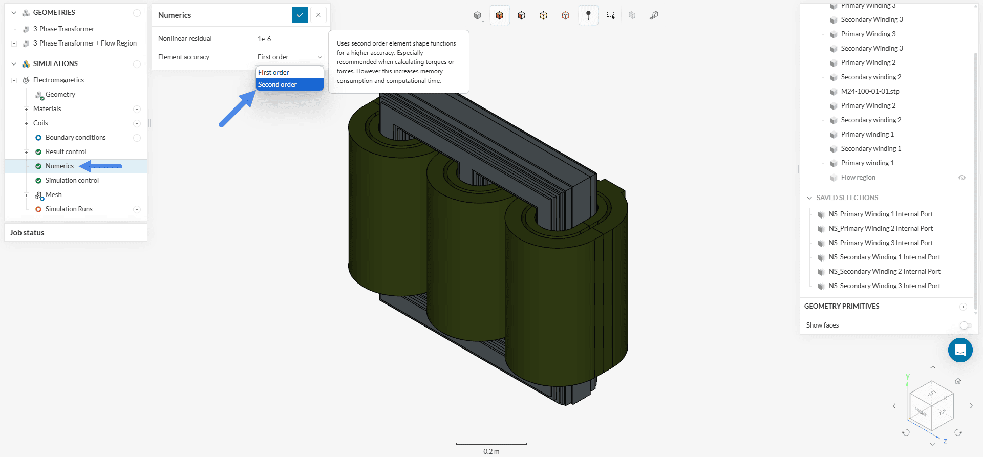 For most analyses, the default settings for Numerics and Simulation control are optimized and do not require modification. The only minor adjustment for this case involves setting the Element accuracy to ‘Second order’ under Numerics. This setting defines a solver interpolation that utilizes second-order (quadratic) shape functions to interpolate electromagnetic field variables (e.g., E, B, etc.) within each element and provides more accurate results at the expense of computational efficiency.