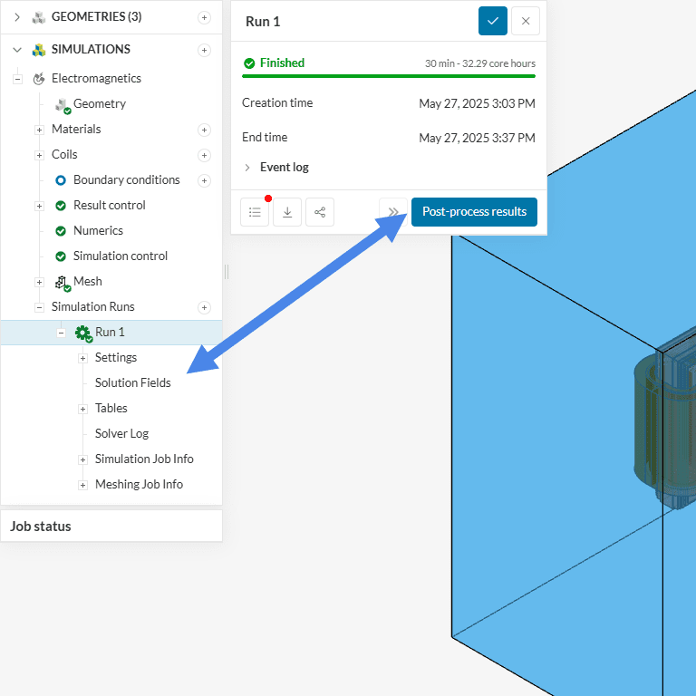 Once the results are calculated and the simulation is over, you can already have a look at them in the post-processor by clicking on ‘Solution Fields’ or ‘Post-process results’, as indicated in Figure 24.