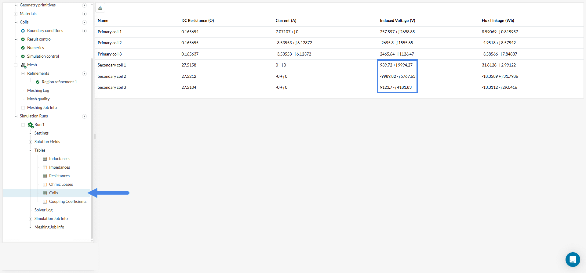 By expanding the tables under the completed run, you can check the induced voltage on the coils — a key result for evaluating the transformer’s efficiency.