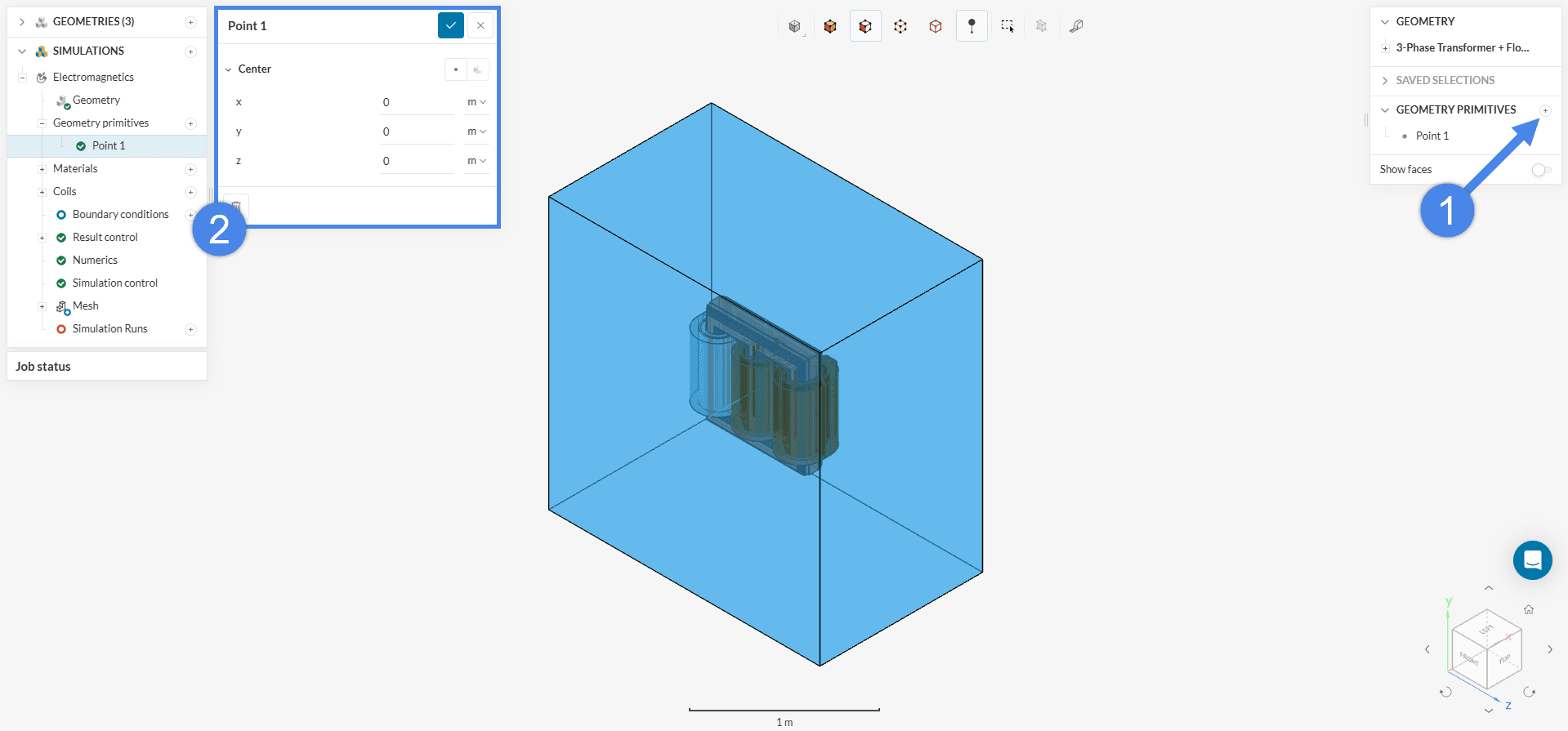 To create the point, click the ‘+’ icon next to Geometry Primitives in the Geometry view and select ‘Point’. You can leave the default coordinates (0, 0, 0), as they represent the center of the core.