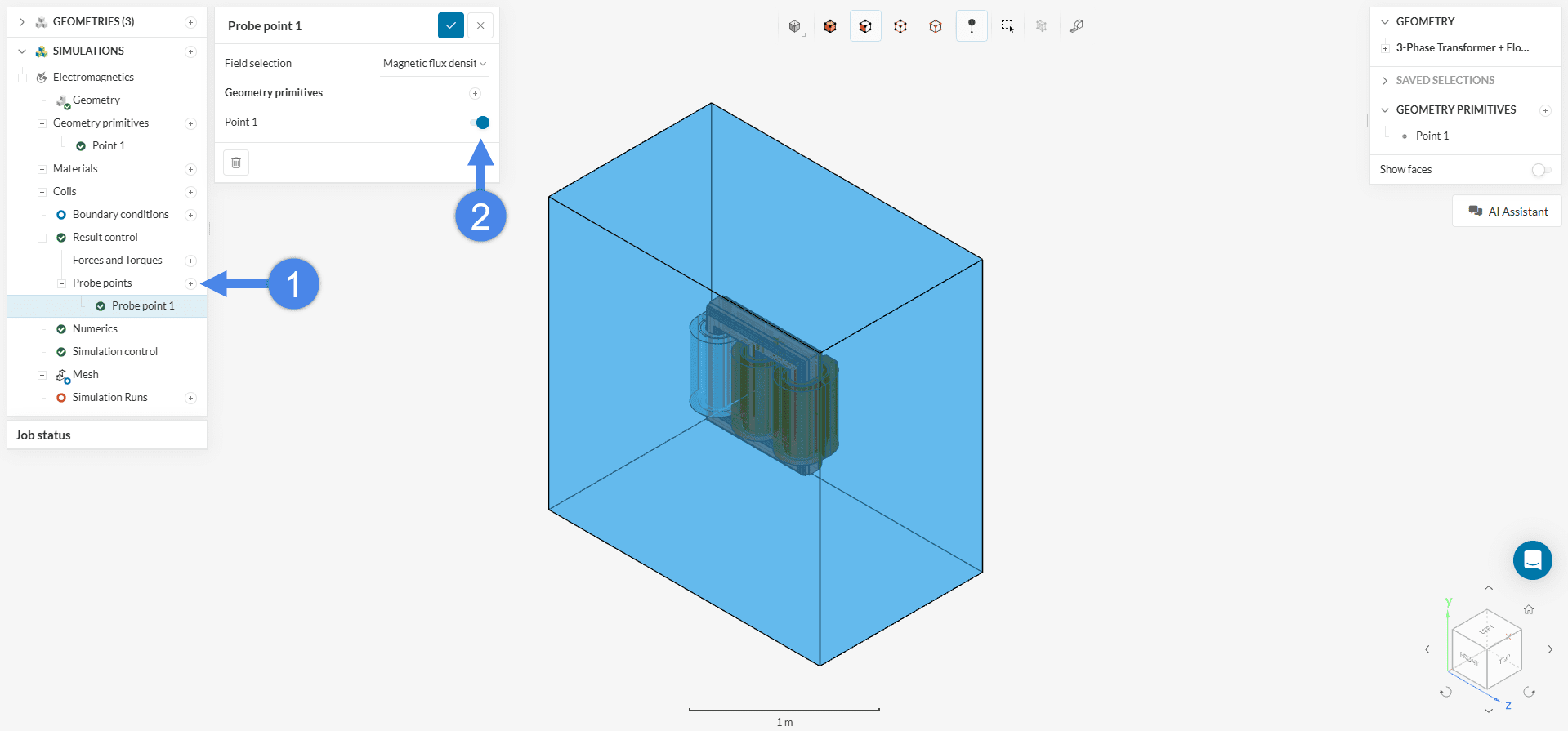 To evaluate this in a 3-phase transformer simulation, we can place a probe point at the center of the core to monitor the magnetic flux density during operation. By comparing the measured value to the material’s saturation threshold from its B-H curve, we can determine whether the core is operating in the linear region or has entered saturation.