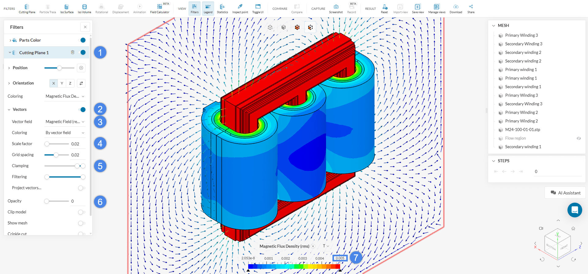 To visualize the magnetic field around the transformer, re-enable the cutting plane and set its Orientation to the ‘X-direction’. Enable ‘Vectors’, set the vector field to ‘Magnetic Field’, and adjust the Scale factor to ‘0.02’. For better clarity, move the clamping slider to ‘90%’ and set the cutting plane Opacity to ‘0’ so only the vectors remain visible. You can also improve gradient visualization by setting the legend’s upper limit to ‘0.005’ \(T\).