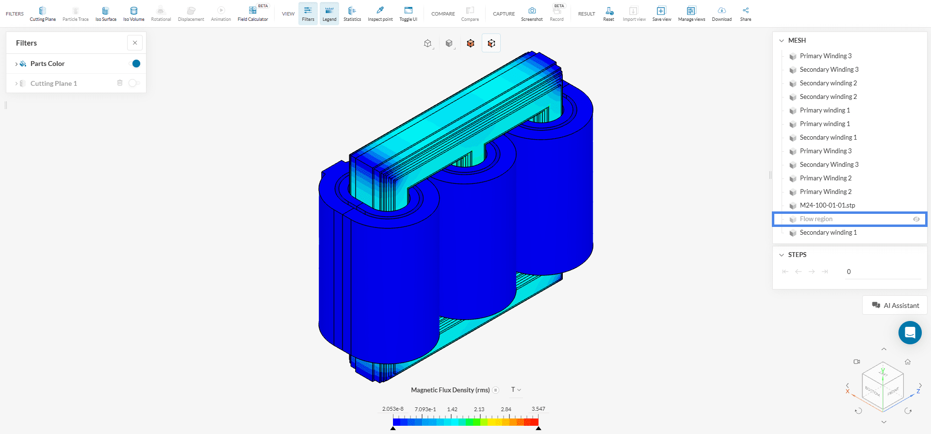 In the post-processor, start by examining the RMS Magnetic Flux Density around the transformer. To do this, turn off the cutting plane, hide the Flow Region, and set Magnetic Flux Density (RMS) as the field shown in the legend.