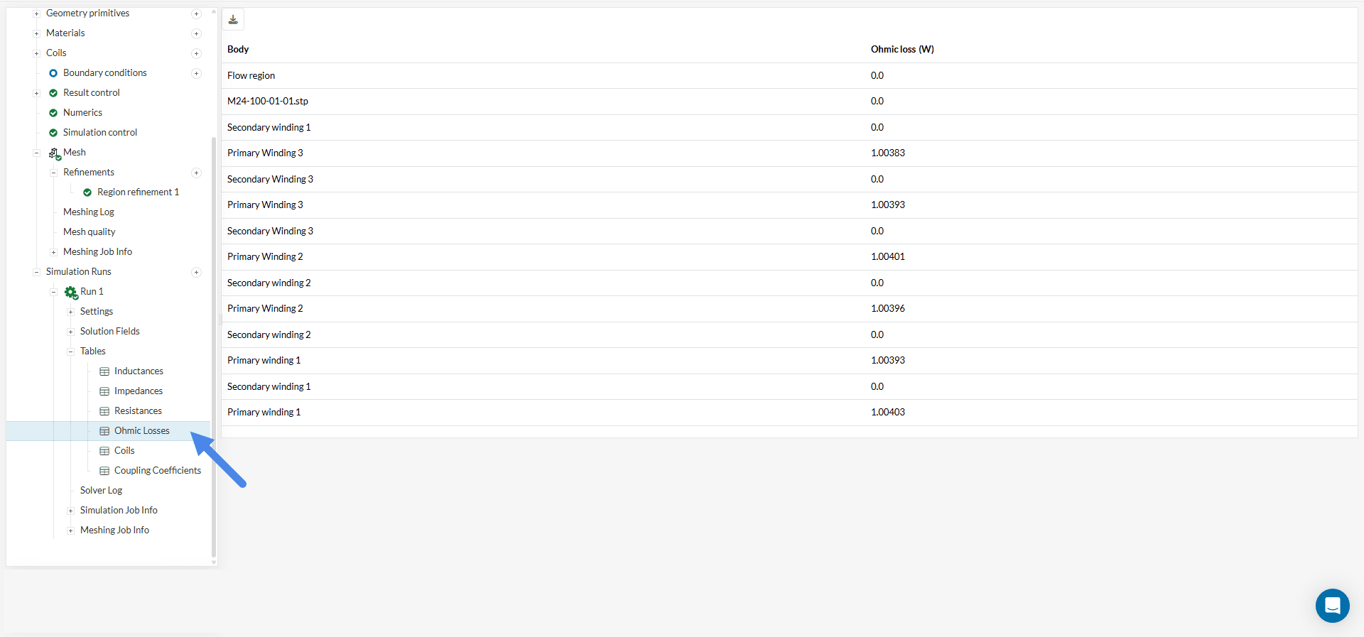 Ohmic losses can also be examined by selecting the corresponding table. These values are crucial for assessing the amount of Joule heating generated by the current flowing through the conductive materials.