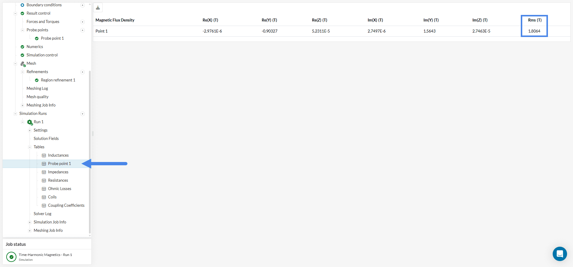 The probe point results are particularly important in this simulation. As shown in Figure 29, the table displays the magnetic flux density at the core, obtained from the previously created result control item. In this case, the RMS magnetic flux density is 1.8064 \(T\).
