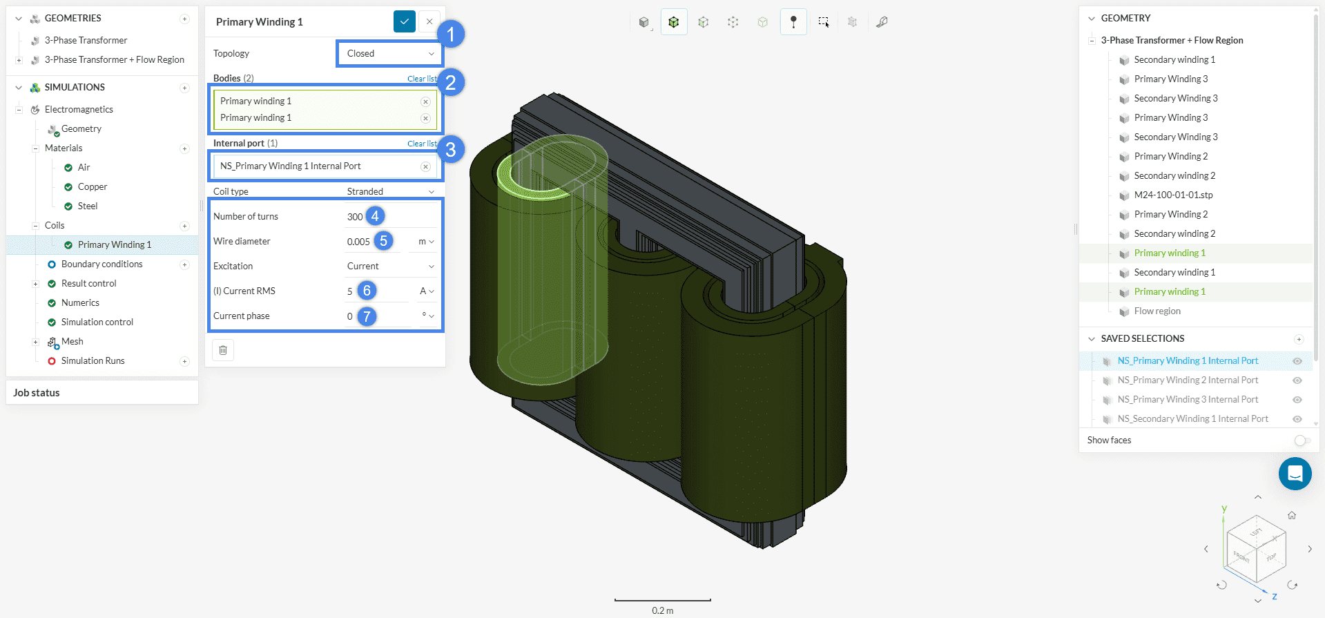 Under Coils in the simulation tree, create a new closed coil. To specify the internal port of the coil it has been cut into two halves, thus both halves are assigned in a single coil setting. Assign the two ‘Primary Winding 1’ solids to Bodies. For the Internal port, an inner face must be selected – you can choose the ‘NS_Primary Winding 1 Internal Port’ saved selection. Then, change the respective values as shown in Figure 14 for Topology, Number of turns, Wire diameters, and (I) Current.
