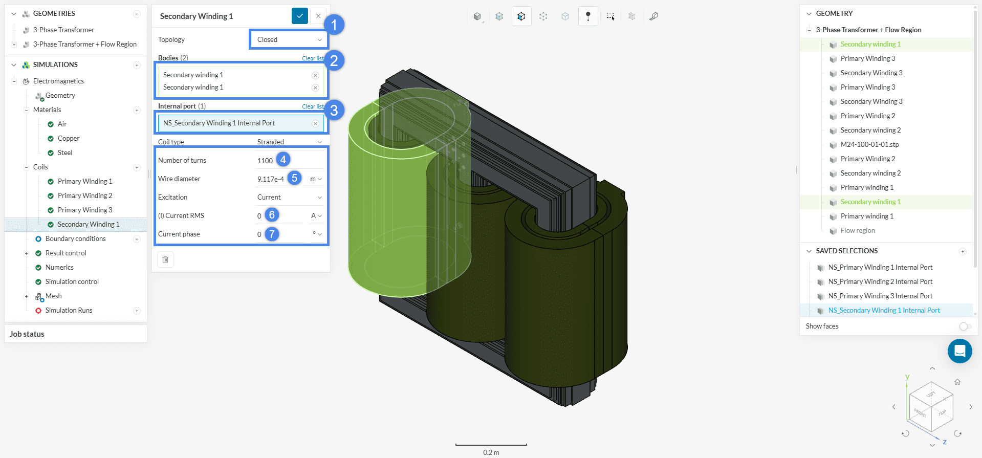 To define the secondary winding coil, simply mimic the steps for setting up the primary winding, adjusting the additional settings as shown in the figure below.
