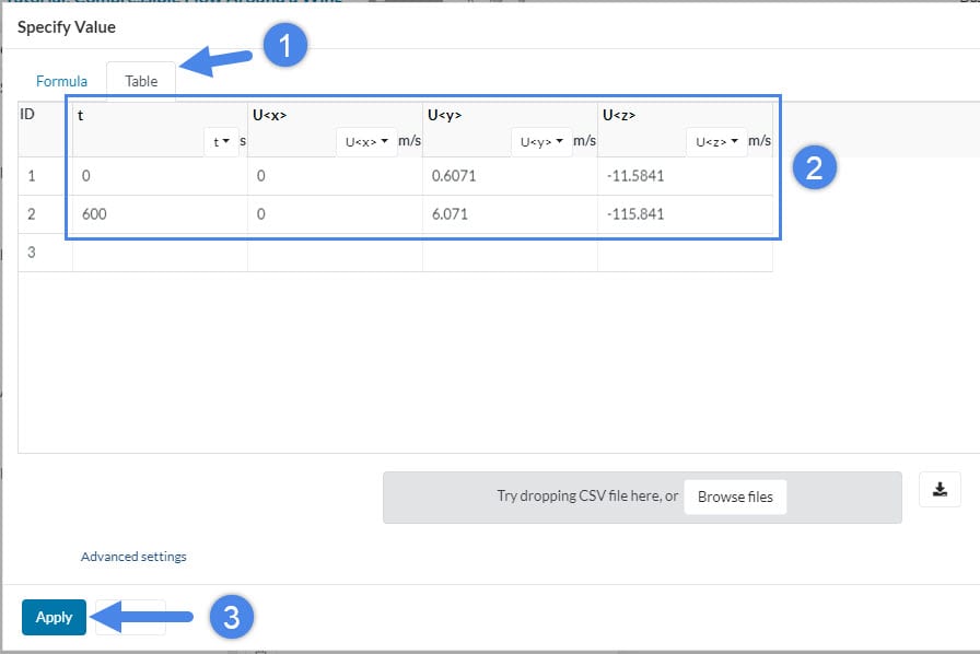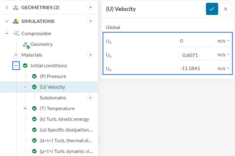 Due to the high velocities involved, compressible simulations require extra care during the setup phase. Aiming to improve stability in early iterations, the velocity will be ramped, starting from a magnitude of 11.6 m/s at iteration 0, to the final magnitude of 116 m/s at iteration 600.