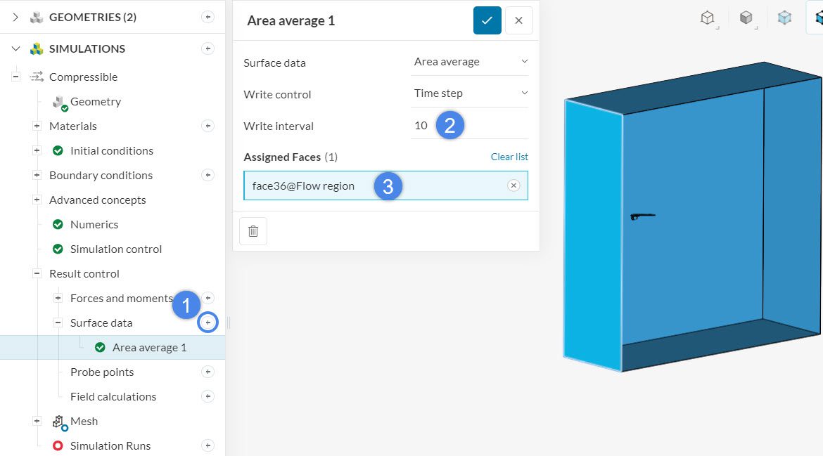 Now, click on the ‘+ button’ next to Surface data to create ‘Area averages’. A total of two controls will be created, one for the inlet and one for the outlet.