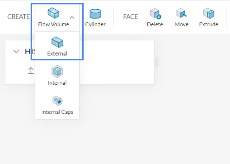 This will allow you to create a draft of the chosen model, and you’ll be able to perform several CAD operations within the same user interface. Once the draft is created, you will find a large number of available operations, which are accessible from the top bar. Using Figure 4 as a reference, you can hover over the ‘Create – Flow Volume’ icon to reveal the drop-down menu, and select the ‘External’ option: