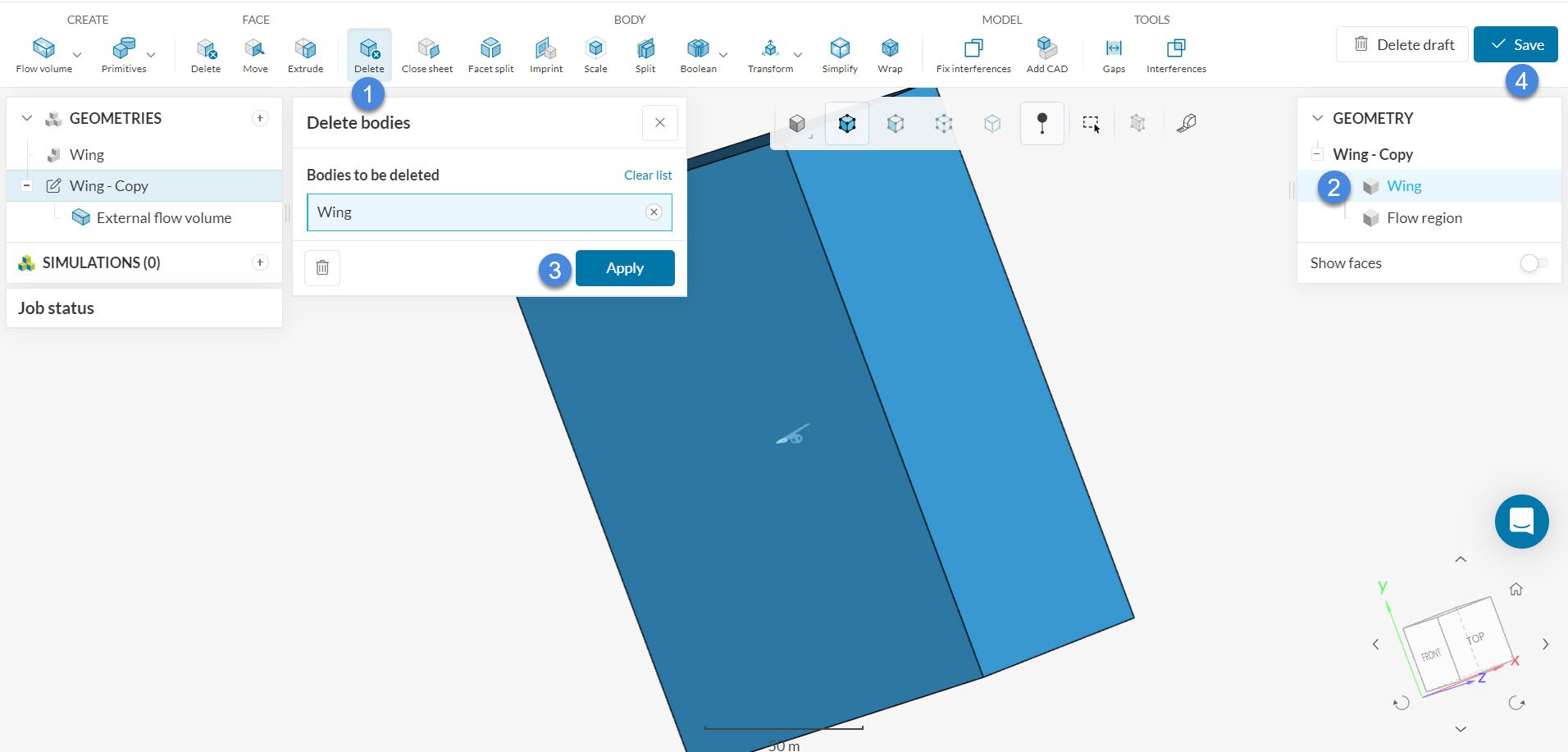 Now the draft is almost ready to save as a new model. Before doing so, we need to delete the volume that represents the solid wing. To do that, please create a Delete body operation and proceed as below: