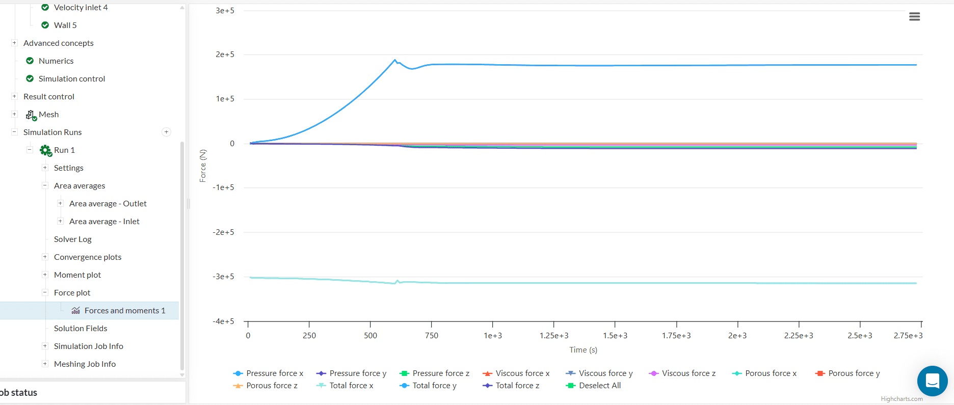 For any wing simulation, force plots are commonly used to assess convergence. By inspecting the force plot from this simulation, we can see that all parameters converge nicely: