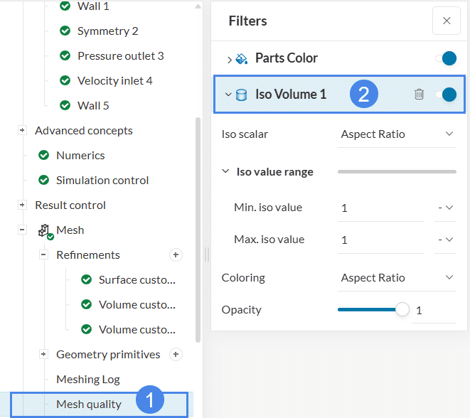 To access this feature, click on ‘Mesh quality’, which is located under Mesh. The post-processing environment then opens up. A particularly helpful filter is Iso Volumes.