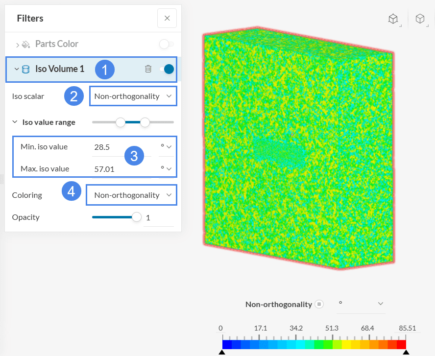By playing with the minimum and maximum iso values, it’s easy to identify bad cells. For example, Figure 41 shows the cells in the mesh, within the specified range of values, according to ‘Non-orthogonality’. Please note that the default iso values in your mesh may be different since the meshing algorithm is constantly being updated.