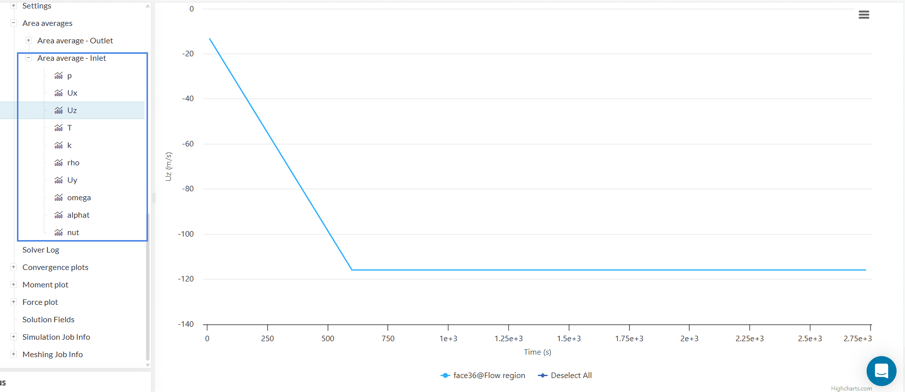 Once the run is finished, open the area average at the inlet result control. By inspecting Uz and Uy, the velocity ramping is clearly appreciated: