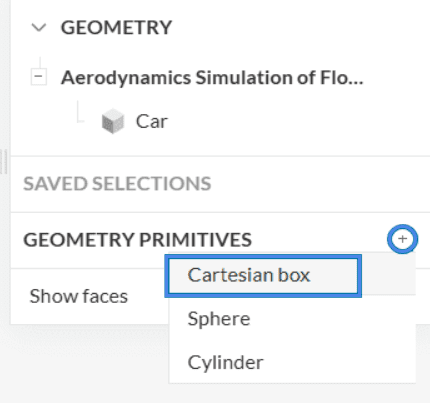 To add a volume refinement of a different size and dimension compared to the entire fluid domain, we can create and use Geometry Primitives. As fluid flows around a body, a turbulent region is developed downstream. This region is called Wake. Since gradients in the wake are often high, we shall refine the mesh in this region. Let us first create a Geometry Primitive that includes this region. In this case, we select to create a ‘Cartesian box’.