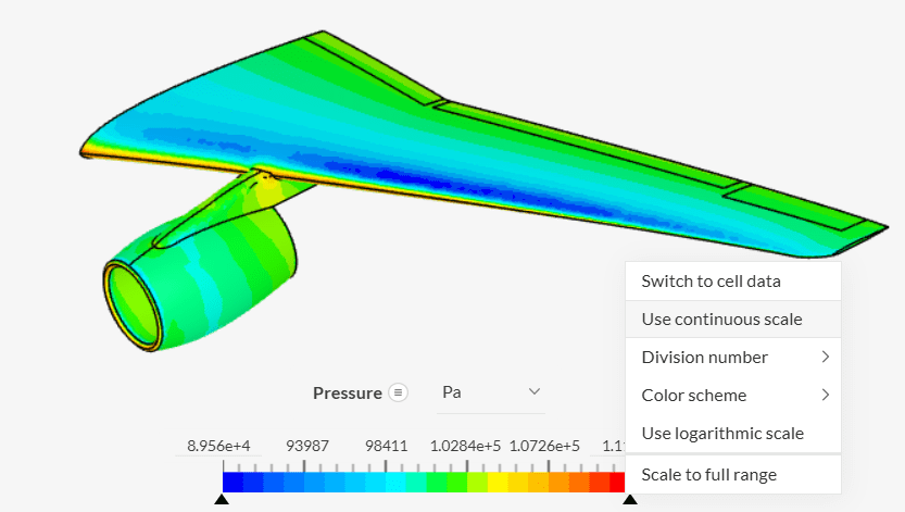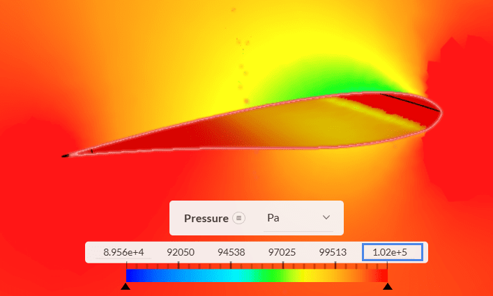 This is how the results will appear if you set visible only the symmetry plane, and apply a value of ‘1.02e5 \(Pa\)’ as the upper limit of the legend at the bottom: