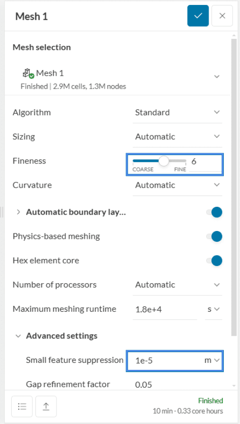 From the main settings, increase Fineness to ‘6’ and in the advanced settings, set Small feature suppression to ‘1e-5’. Retain the default values for all the other settings.