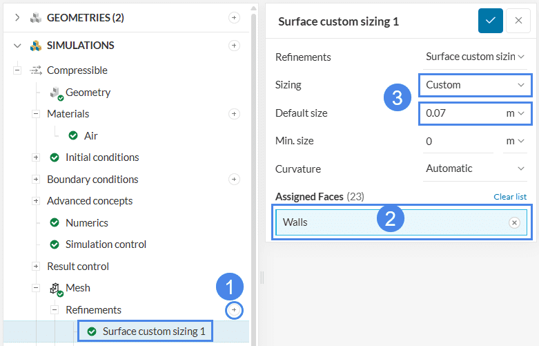 Click on the ‘+ button’ next to Refinements. A ‘Surface custom sizing’ will be assigned to the ‘Walls’ saved selection. Set Sizing to ‘Custom’ and the Default size to ‘0.07’ meters: