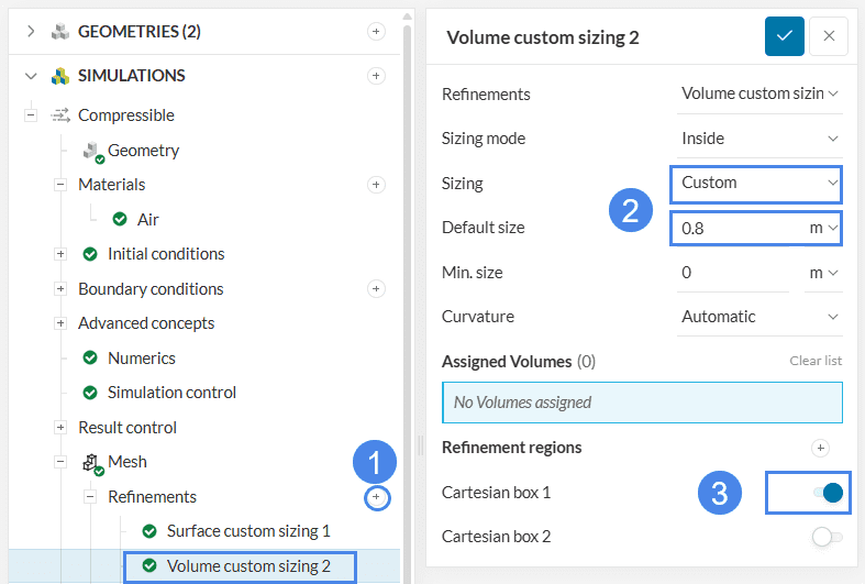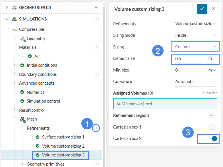 First, create a new Volume custom sizing refinement. Specify Sizing as ‘Custom’ and set the Default size to ‘0.8’ meters and toggle on the ‘Cartesian box 1’ we created in the previous section.