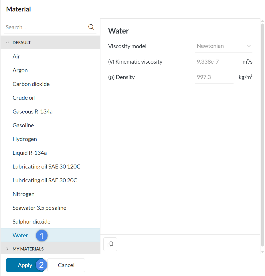 This will open the Material library which contains all the available materials for a simulation. Scroll down to select ‘Water’ and click ‘Apply’.