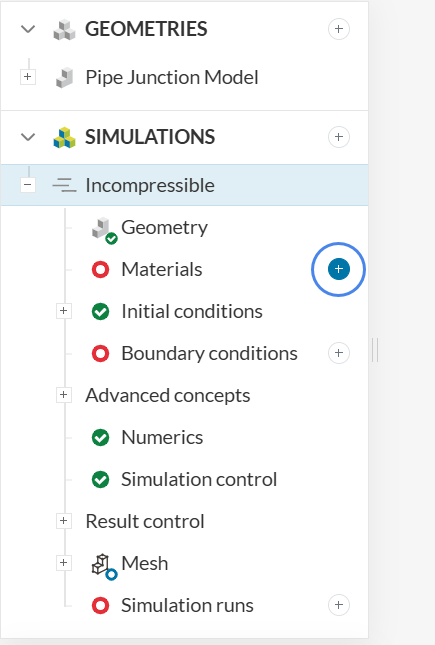 To assign a new material, click on the ‘+’ button next to Materials in the simulation tree.