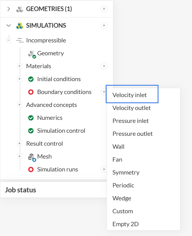 To create a new boundary condition, click on the ‘+’ button next to Boundary conditions in the simulation tree. Select ‘Velocity inlet’ from the list.