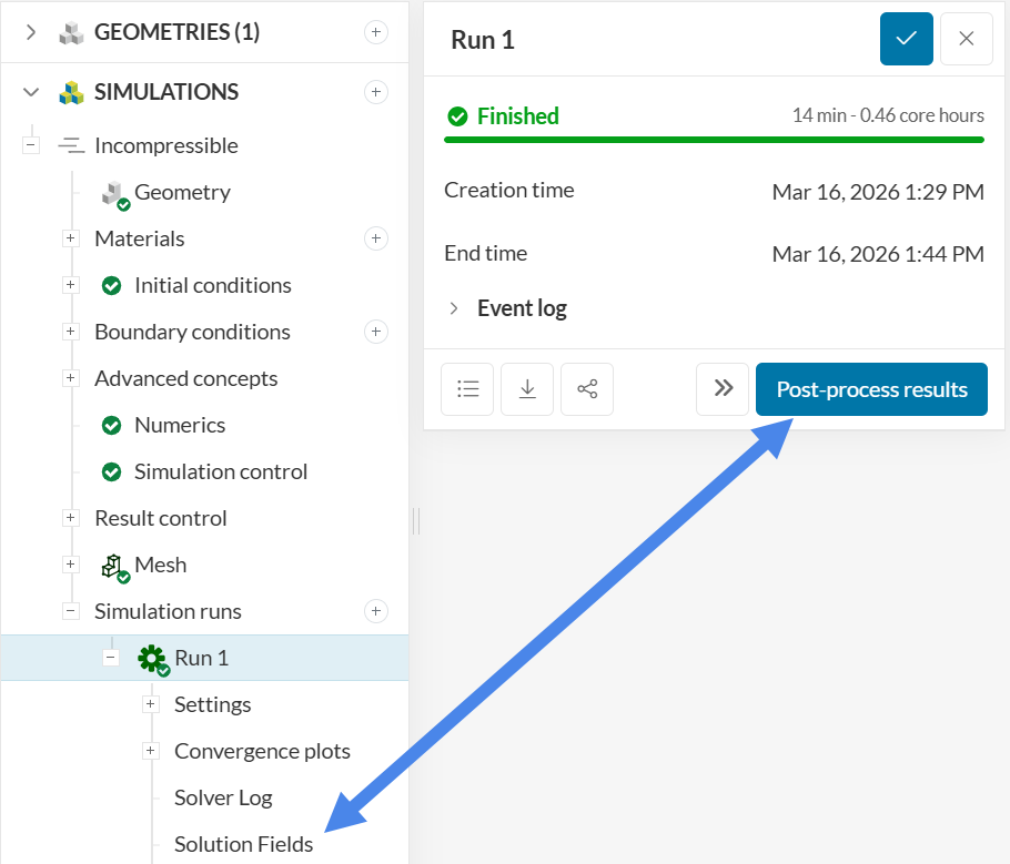 Click ‘Post-process results’ or ‘Solution Fields’ under the run to open the post-processor. SimScale’s integrated post-processor consists of filters and different viewing tools to better visualize and download the simulation results.