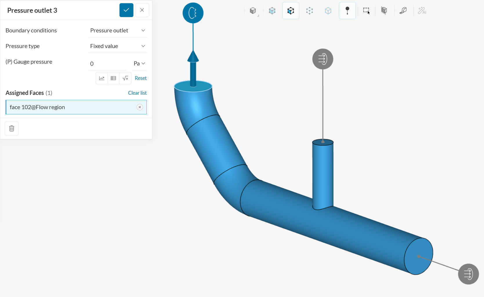 Last but not least, we will add a third boundary condition which is the ‘Pressure outlet’, indicating the face where the fluid will leave the domain. Select the face below to assign it as a pressure outlet boundary condition.