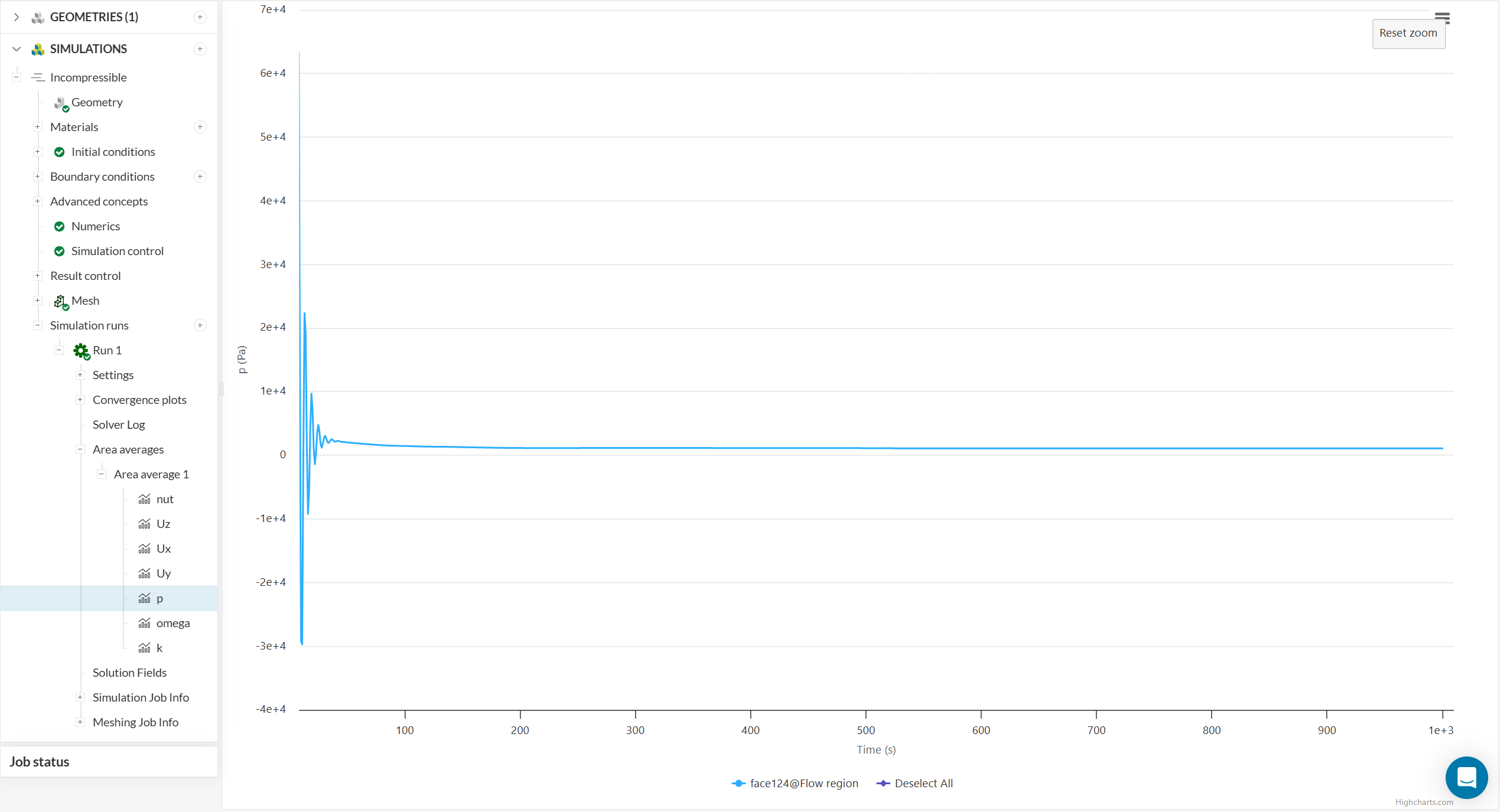 Once the simulation run is finished, the status will be changed to Finished in the run settings panel.