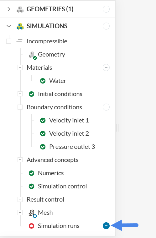 In the background, SimScale will generate the mesh and, as soon as it is finished, the simulation will start automatically. As such, create a simulation run by clicking on the ‘+’ button next to Simulation runs in the simulation tree.
