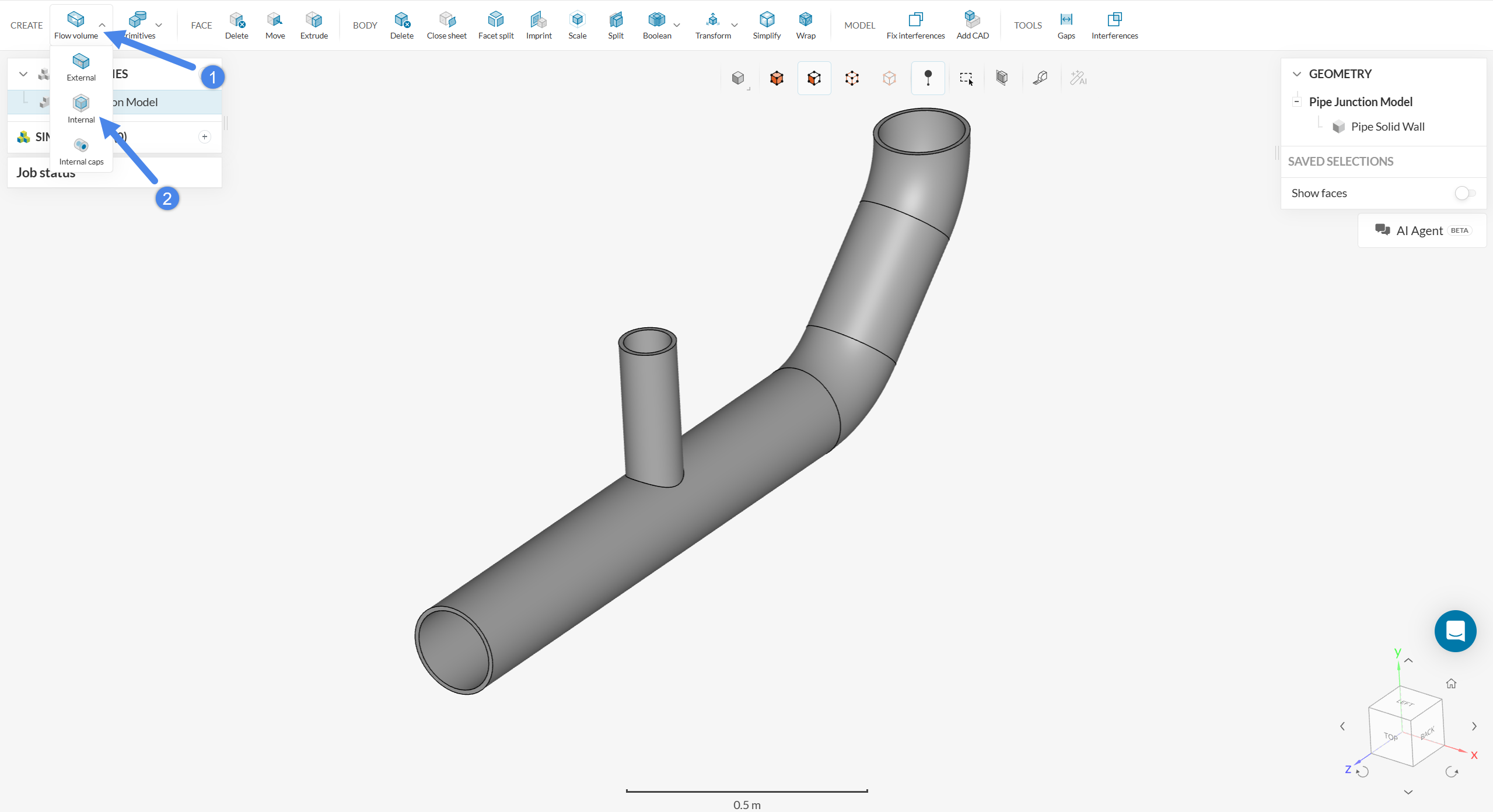 The initial CAD model contains the solid walls of the pipe but not the volume occupied by water. As such, before setting up the simulation, a Flow region, representing the fluid domain, needs to be created.