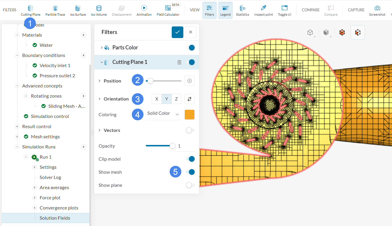 To get more details on the flow behavior inside the turbine, use the Cutting plane filter.
