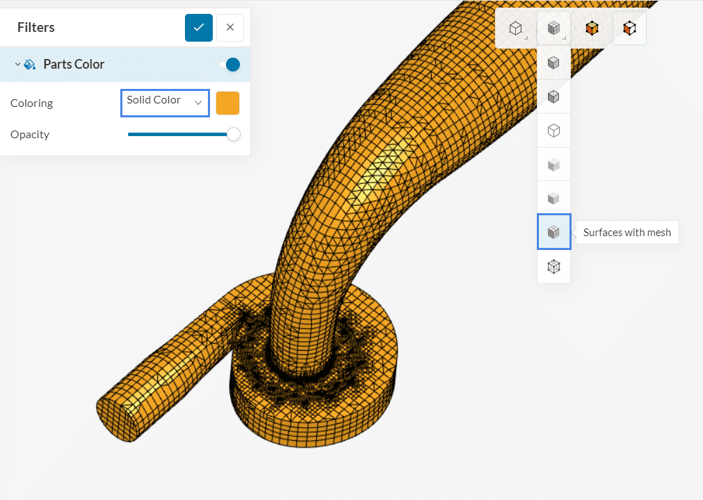 Once inside the post-processor, under the Parts Color filter change Coloring to any solid color of choice and then change the render mode to Surfaces with mesh to show opaque surfaces of the CAD model with the mesh grid.